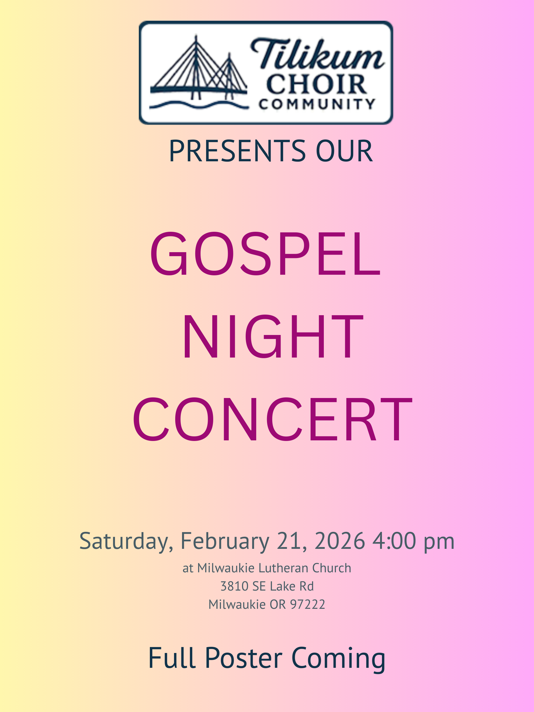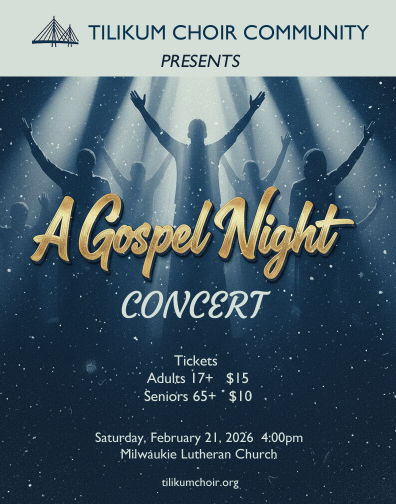 The Tilikum Choir Community's mission is to provide choral performance opportunities and choral education for all members of the community. We bring together enthusiastic singers from the Portland Metro area to foster connection and create joy through high-quality, passionate choral singing, achieved by intentional rehearsal and inspired performances.