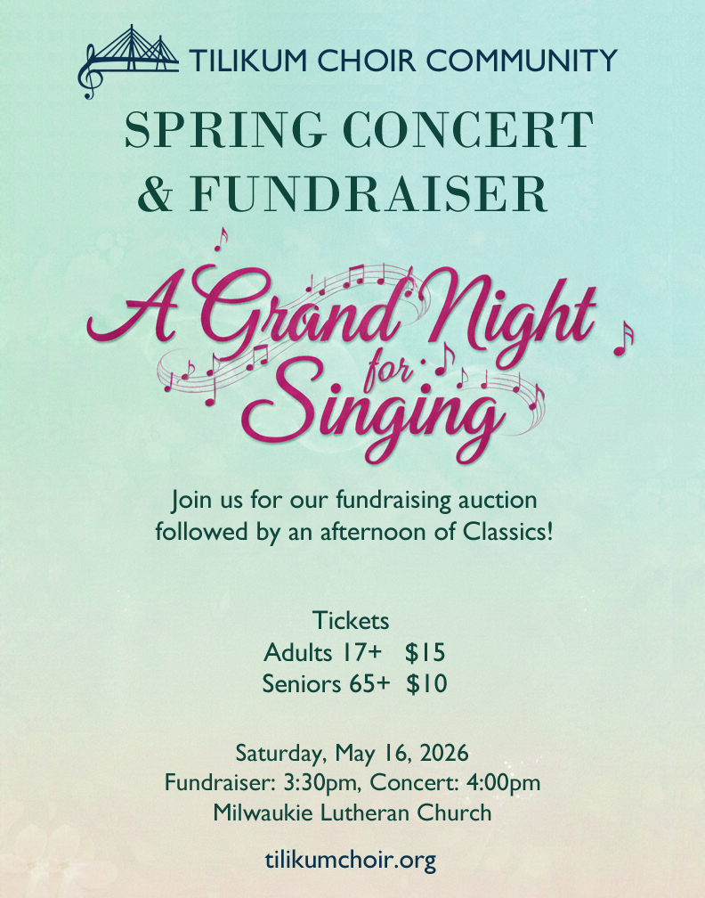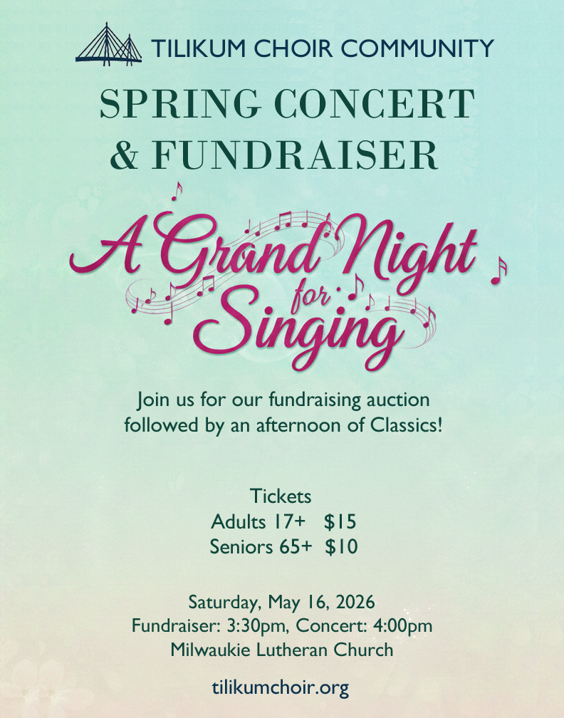 If a financial contribution presents a hardship, contact membership@tilikumchoir.org or speak with Sandy Baker. We are committed to making the choir accessible and will work with members to ensure that anyone who wishes to participate is able to do so!
